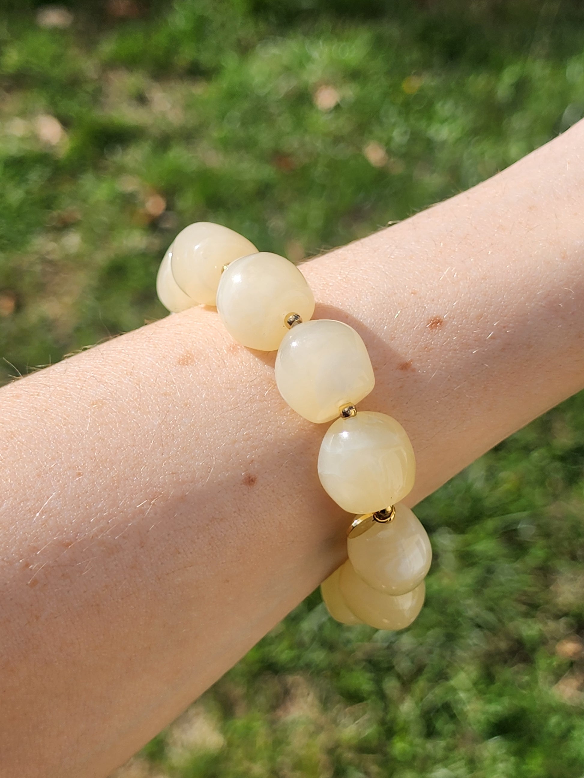 - Bracelet élastique orné de perles en résine couleur vanille, séparé de perle en acier inoxydable doré.