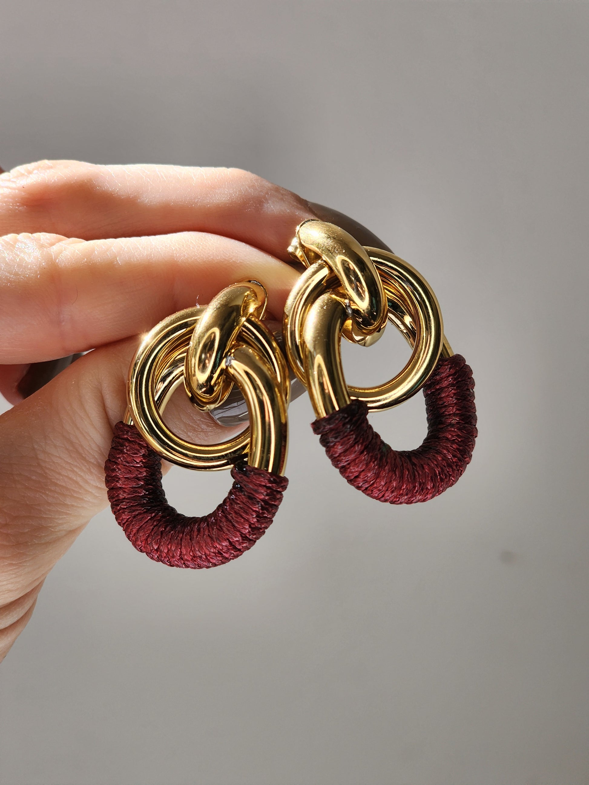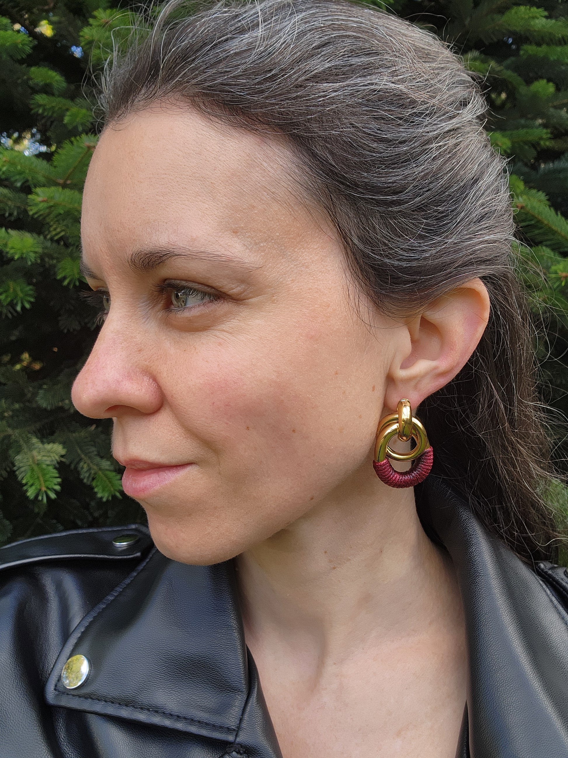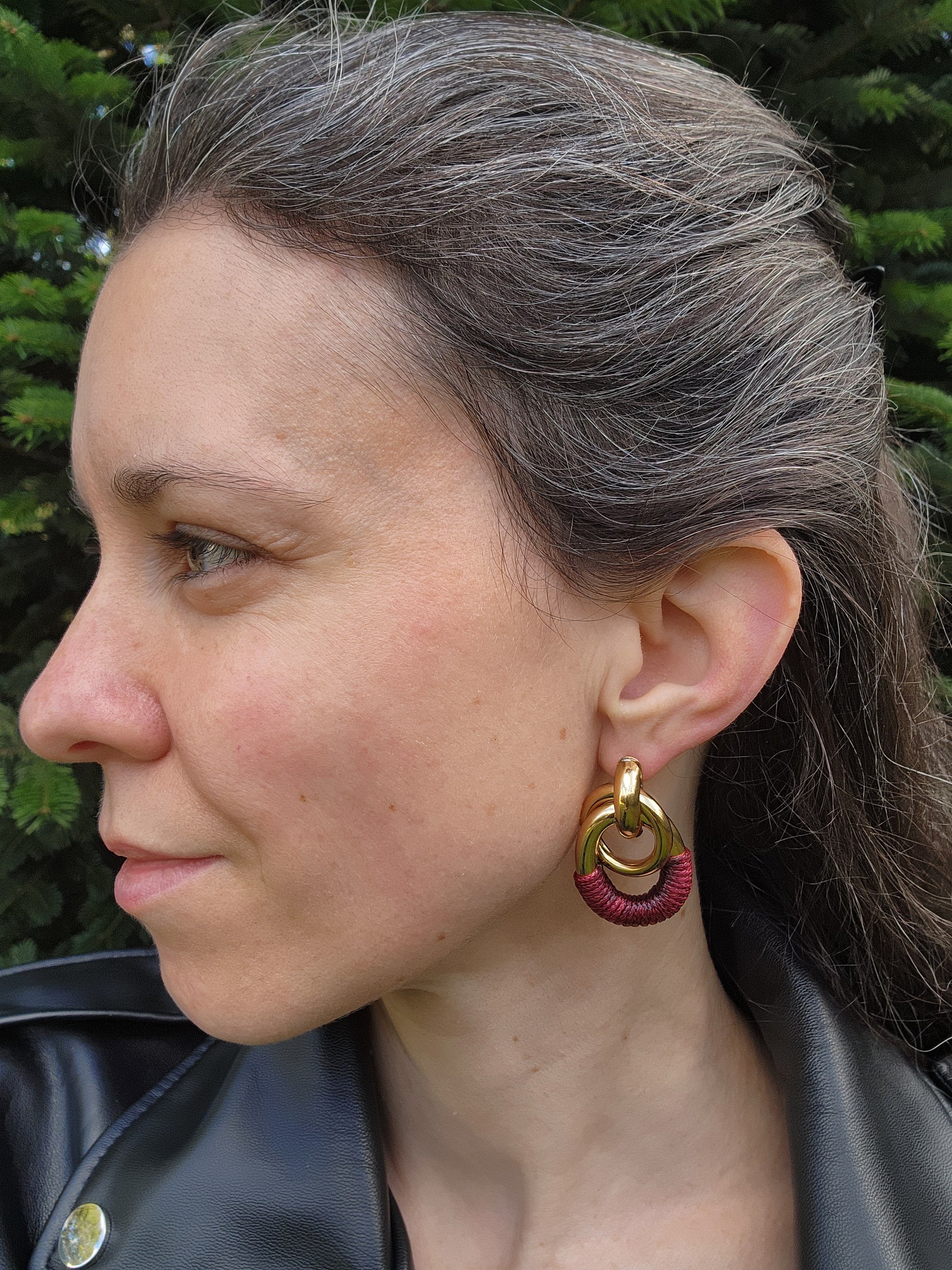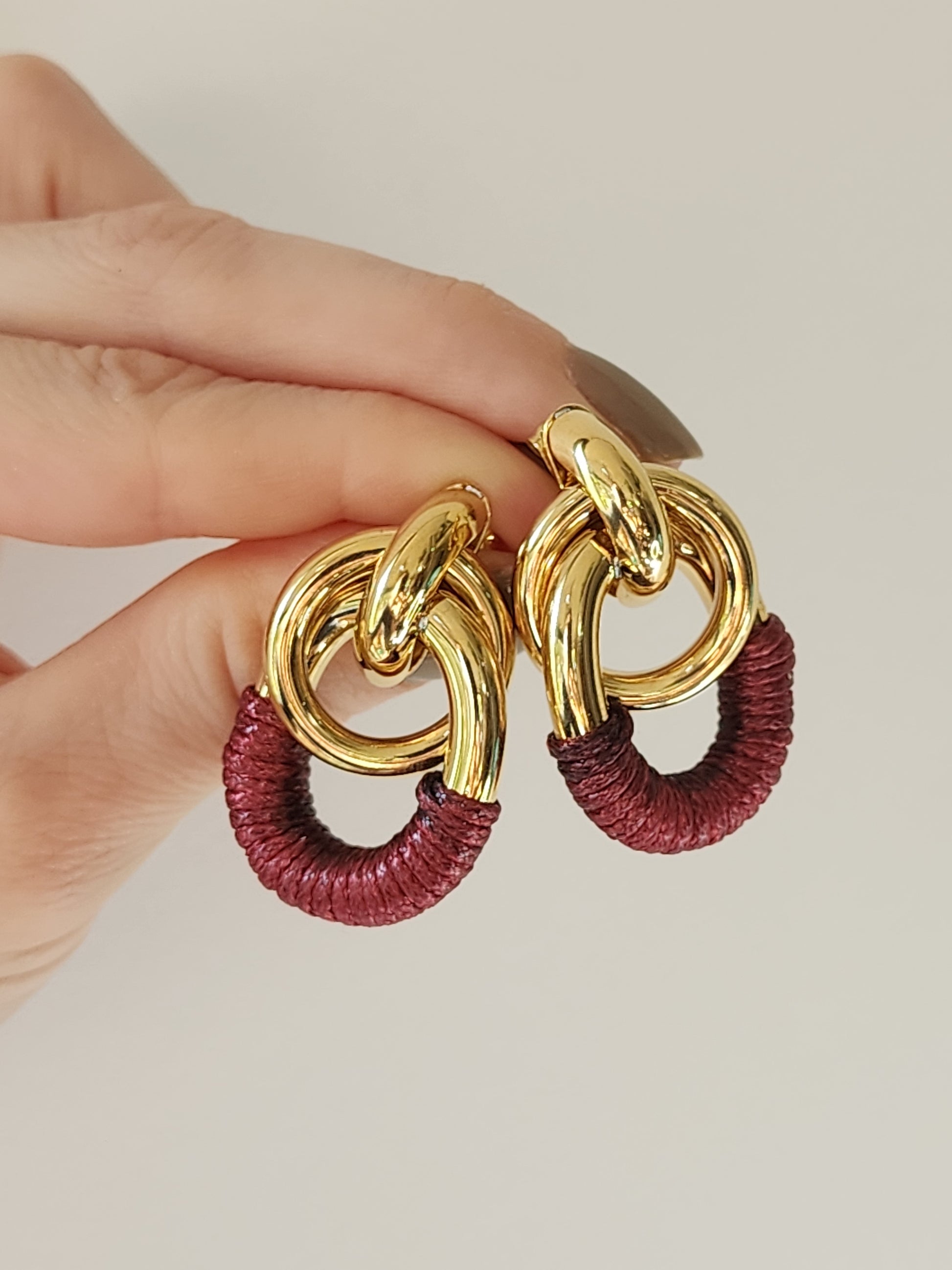 - Boucles d'oreilles en acier inoxydable et cordelette bordeaux.