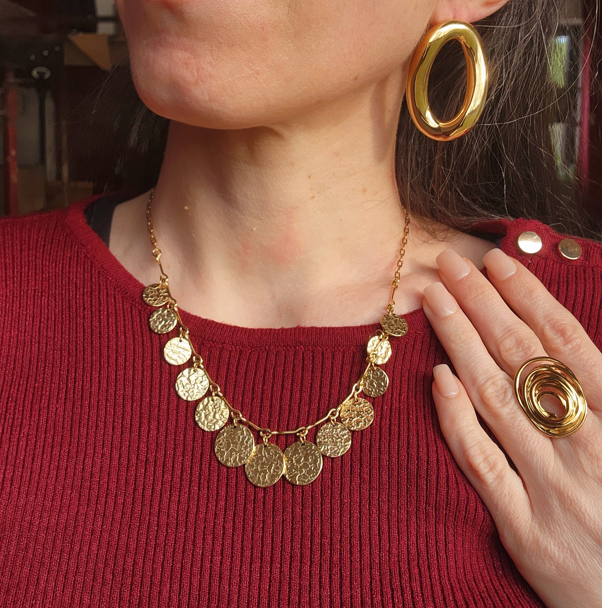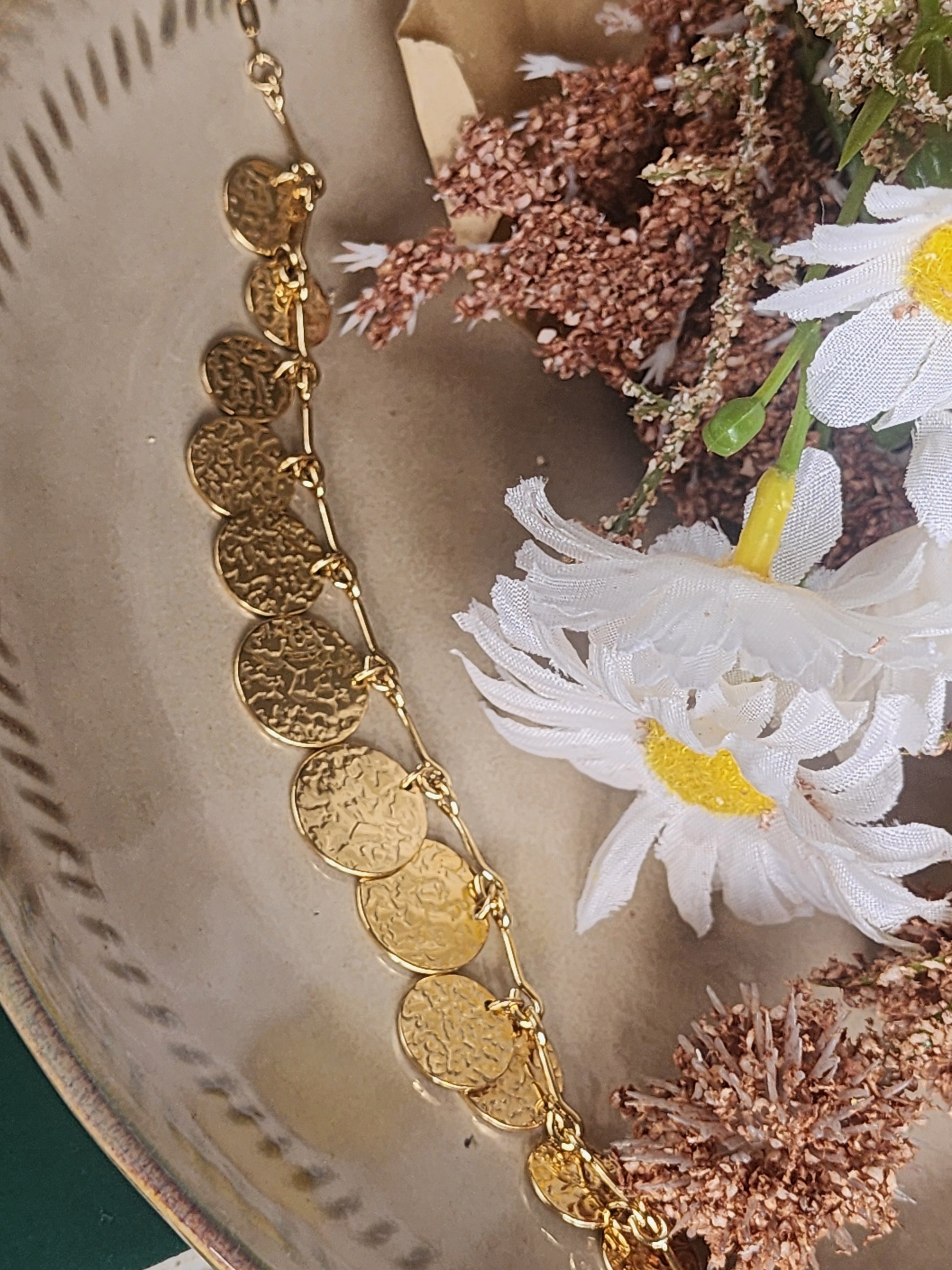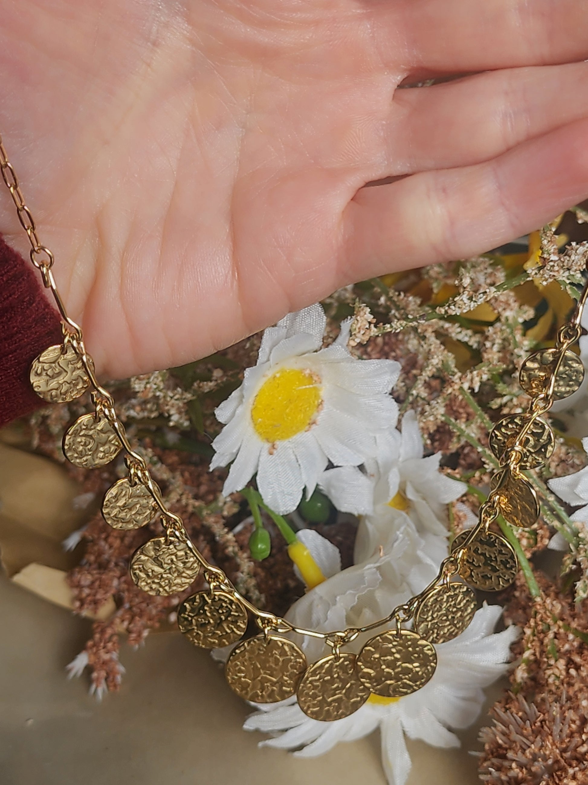 Collier en acier inoxydable accompagné de 13 pampilles rondes effet martelés.